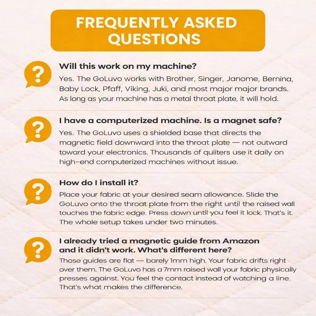 Women who switched from flat magnetic guides to the GoLuvo don't just sew straighter — they get back to enjoying the craft they nearly walked away from.